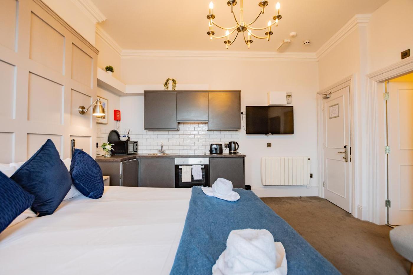 Deluxe Double Studio. Providing free toiletries, this studio includes a private bathroom with a shower and a hairdryer. Meals can be prepared in the kitchenette, which comes with a stovetop, a refrigerator, a dishwasher and kitchenware. The studio provides a flat-screen TV, a washing machine, a seating area, a dining area as well as sea views. The unit offers 2 beds.
