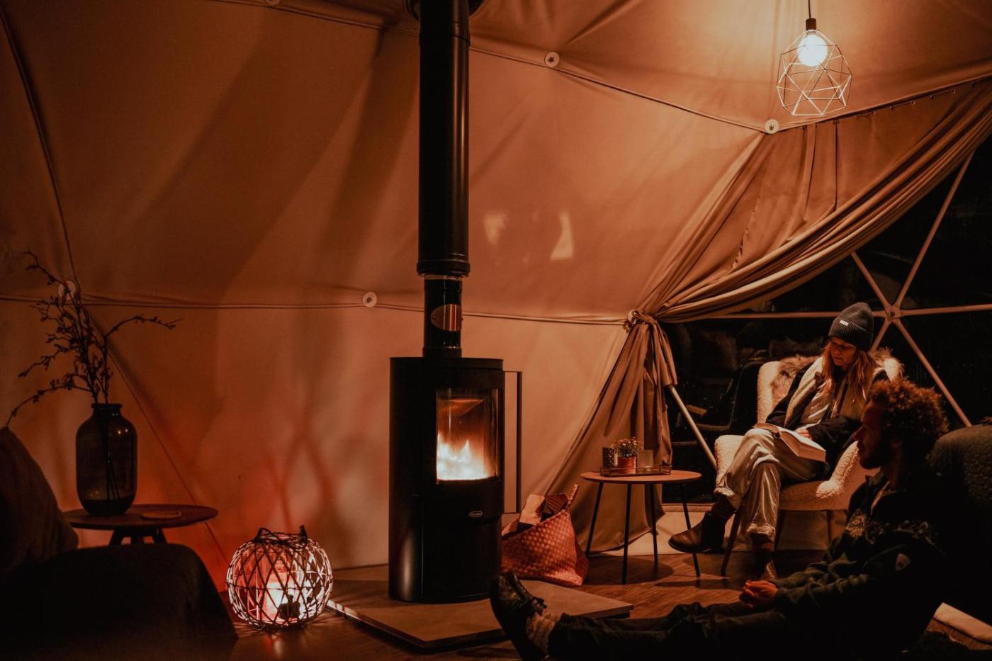 Tent. This tents special feature is the fireplace. Guests will find a refrigerator, kitchenware, a microwave and a tea and coffee maker in the kitchen. The tent also provides guests with a barbecue. This tent features a seating area, an outdoor dining area, garden views and a shared bathroom. The unit offers 1 bed.